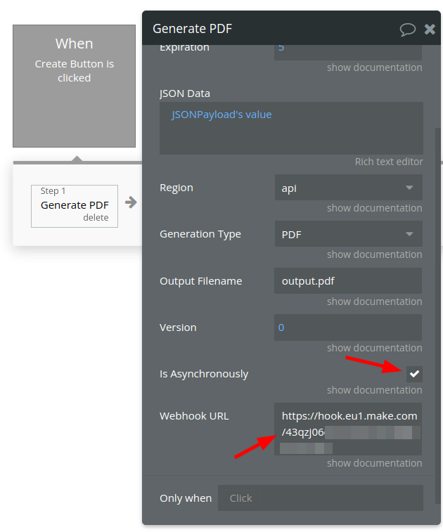 Step 6. Setup the Generate PDF action in Bubble and make sure Is Asynchronously is checked. Next, paste the copied webhook URL(from Make.com) in the Webhook URL field.