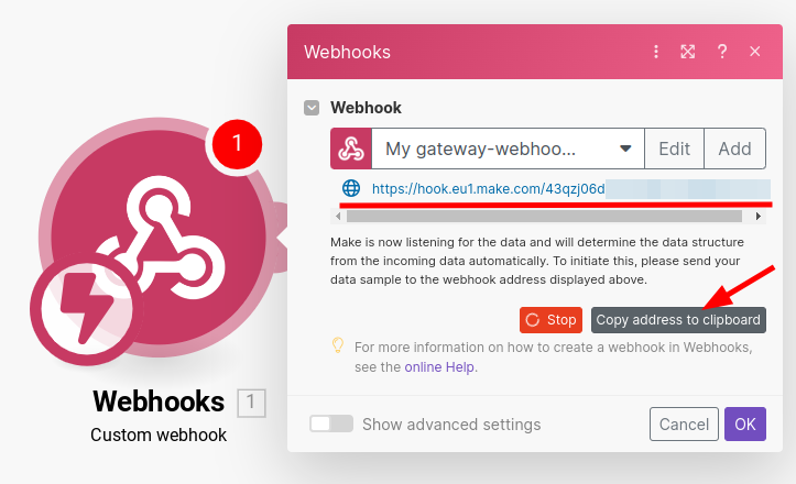 Step 4. Once the webhook URL is generated, click on Copy address to clipboard to copy the Webhook URL.