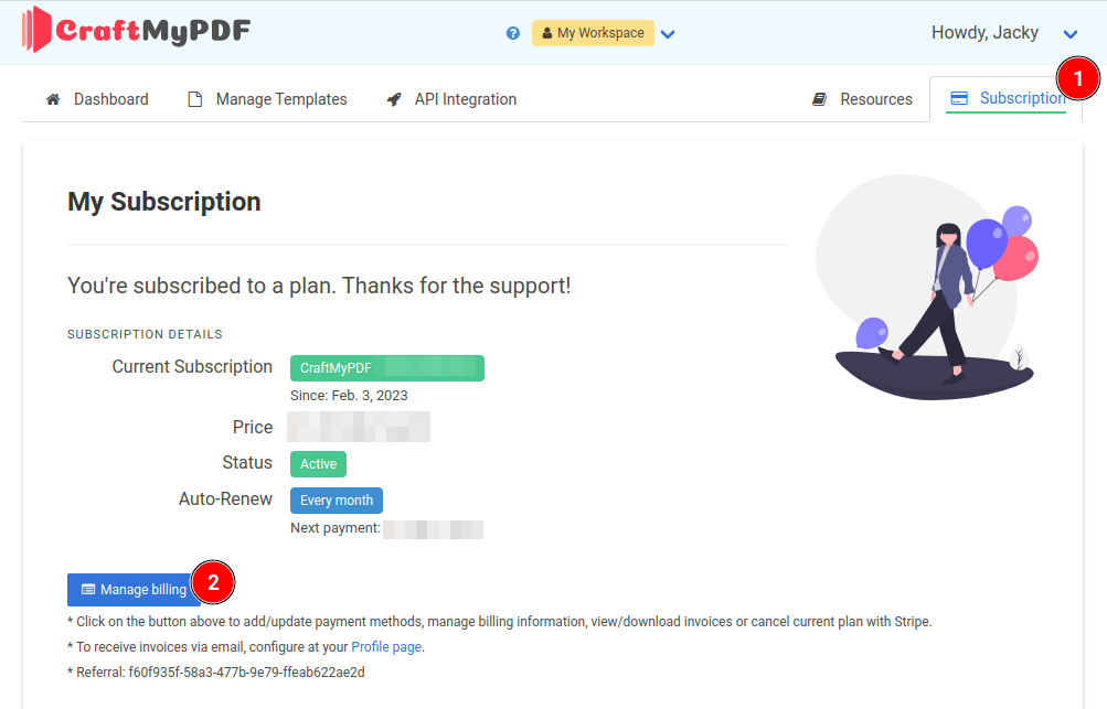 1. Navigate to your subscription page (https://app.craftmypdf.com/subscriptions/)