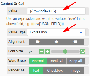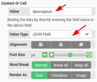 - To access the items, use the variable row. For example, if the Data Source is set to {{data.items}} and there is a field named description in the items array, you can enter an expression like {{row["description"]}} in the Value field.
