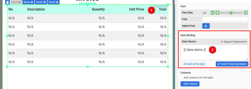 Configure Data Binding to bind the Simple Table to an array