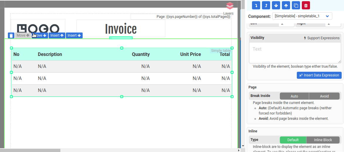 The Simple Table component is specifically designed to present an array of data in tabular format. It offers a hassle-free way for displaying repeating rows of information without the need to use a data-bound Normal Section.