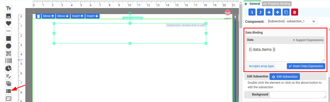 You can bind an array to a section. To enable data binding for a subsection, enter an expression in the Data property to bind an array.