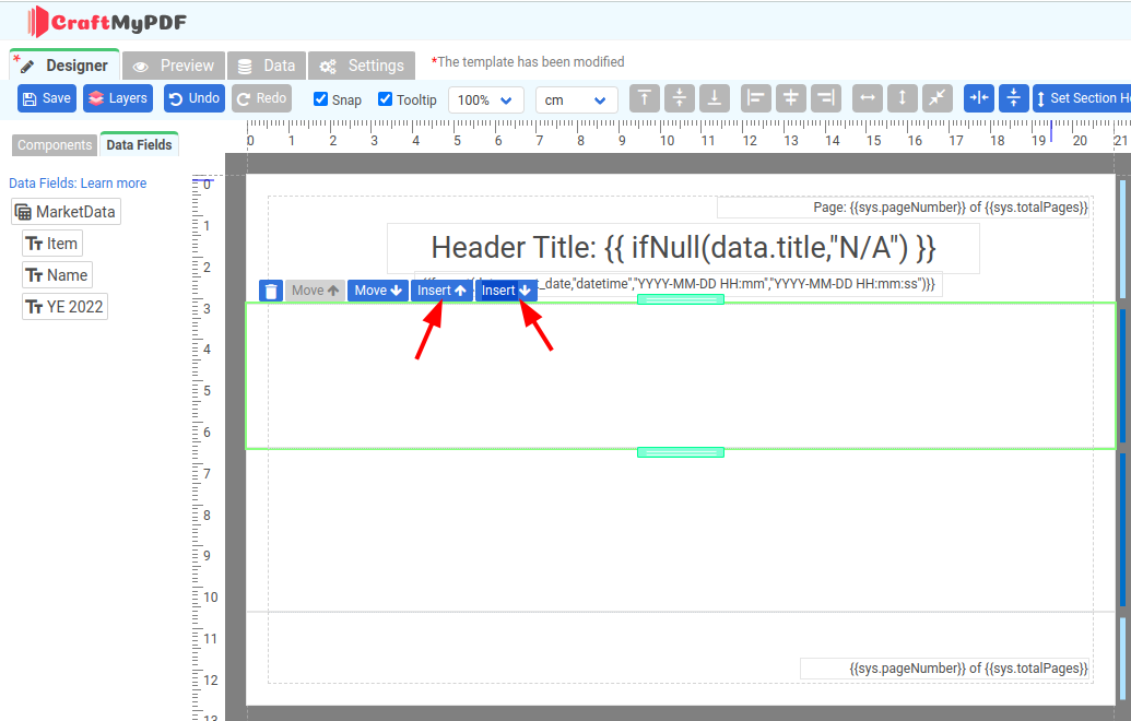 To create a multi-page PDF, first, you have to create a new section by clicking the “Insert Above” or “Insert Below” buttons. You can find these buttons as shown below.