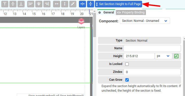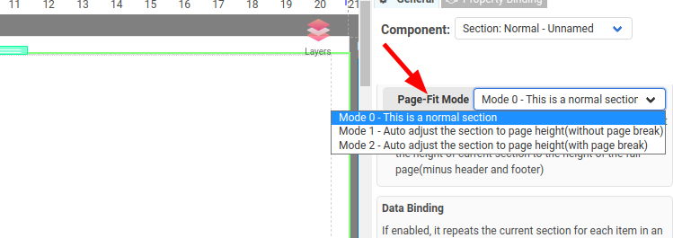Step 2: In the property panel look for the property Page-Fit Mode, select either Mode 1 or Mode 2. Once either Mode 1 or Mode 2 is selected, the designer automatically adjusts the height of the section to full-page during the design mode.