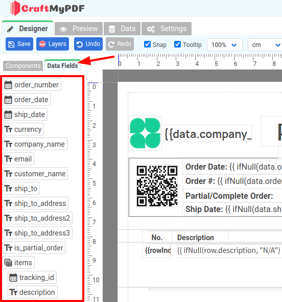 The Data Fields tab simplify the creation of components.