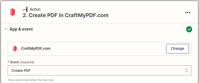 1. To get started, the first step is to choose CraftMyPDF as the app and select "Create PDF" as the event within Zapier.
