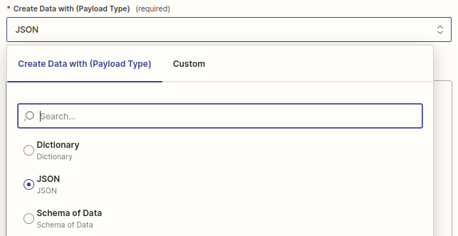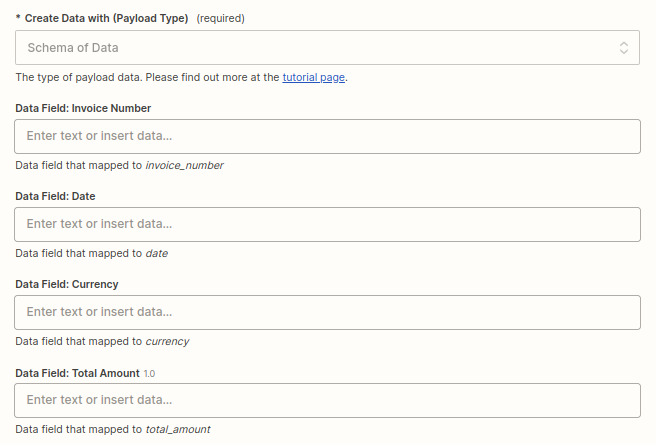 i. Schema of Data(Recommended): This option automatically generates input fields based on the sample data in the Data tab of the template editor. It simplifies the process of creating payload data by providing a straightforward way to define the required information.