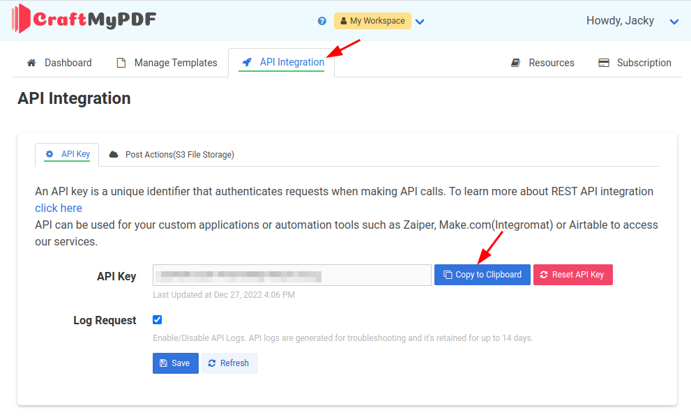 The API key can be obtained from the CraftMyPDF dashboard's API Integration tab. This key acts as a secure access point to your CraftMyPDF account, allowing Zapier to interact with it on your behalf.