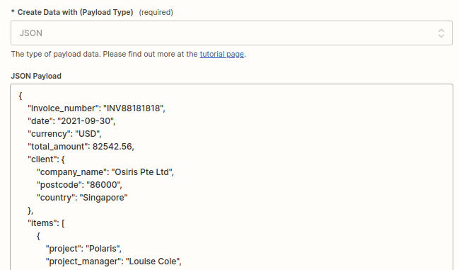 Please use the following format for the keys in your Zap: