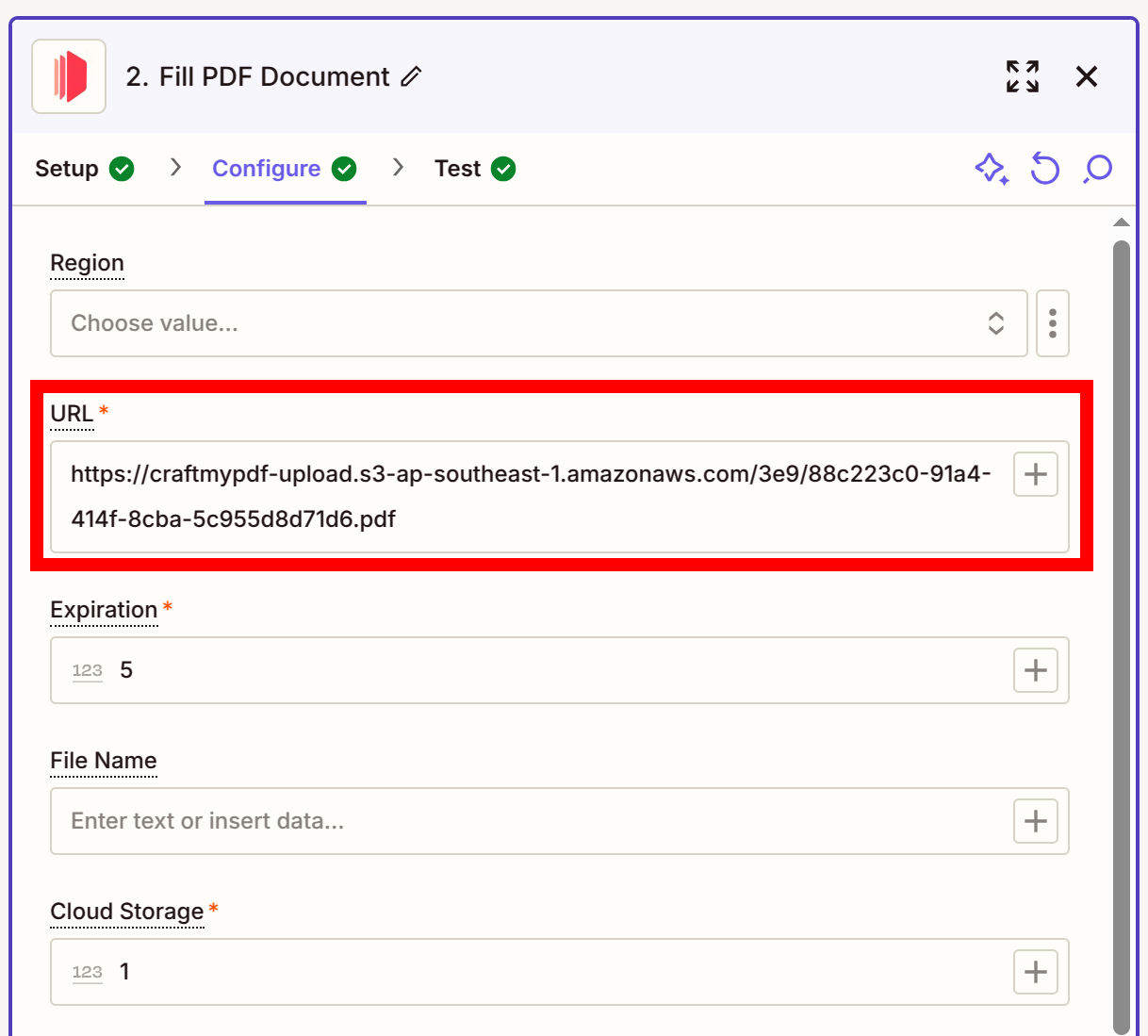 Step 4. Then paste the PDF URL into the URL in Zapier
